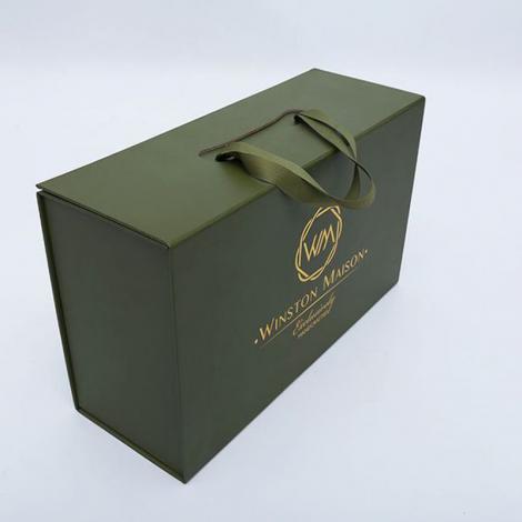 Material made of rigid paper with magnet closure. This garment box wih handle design .